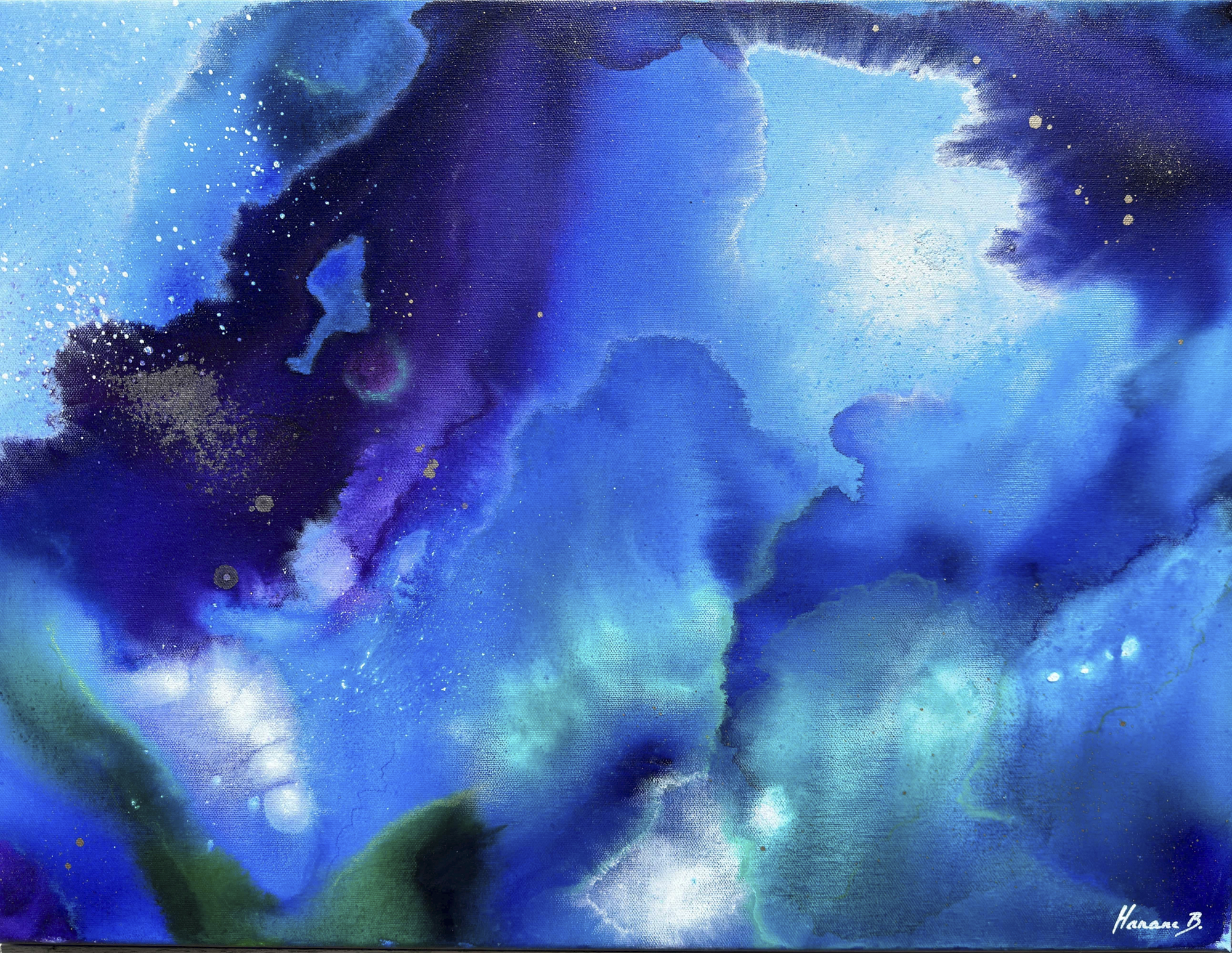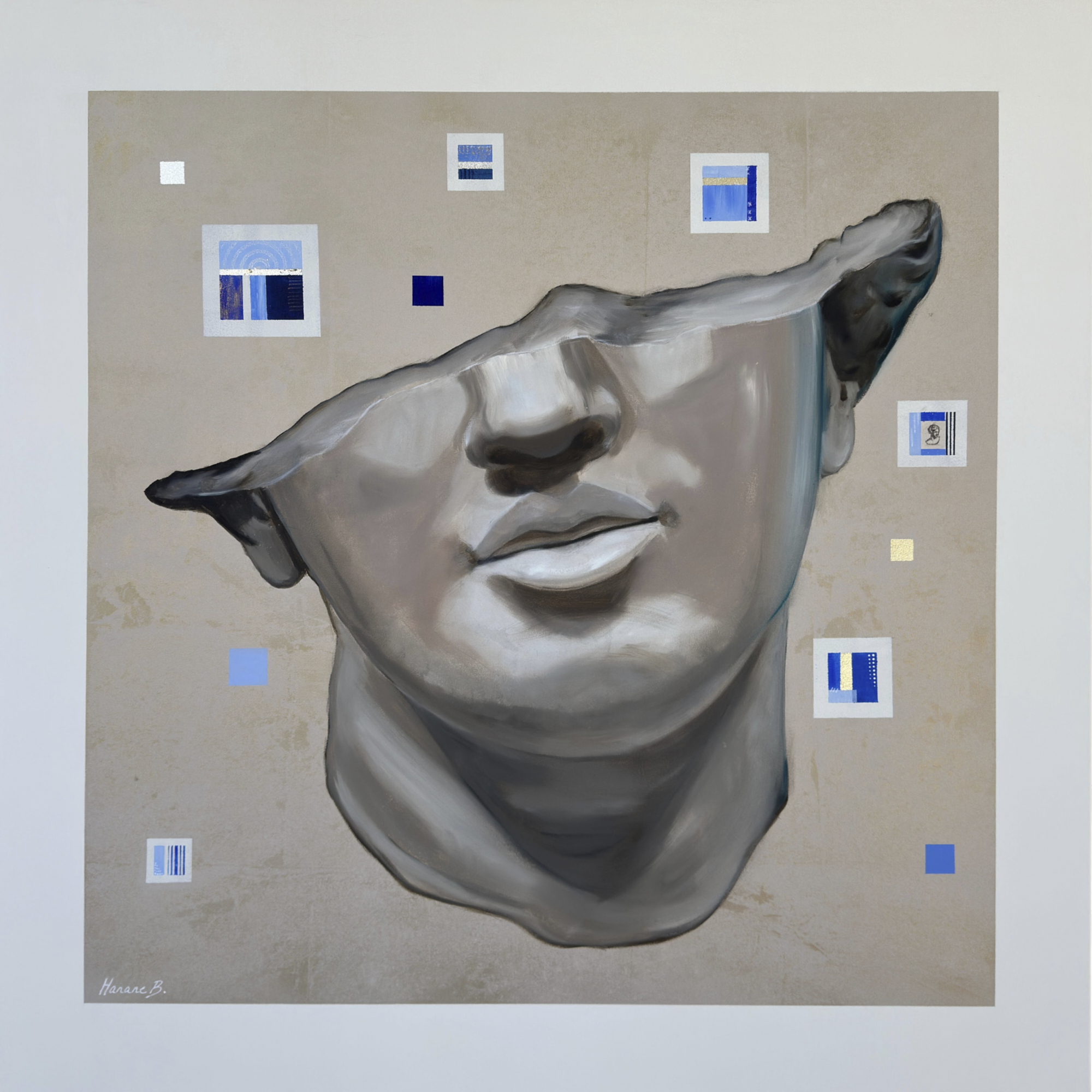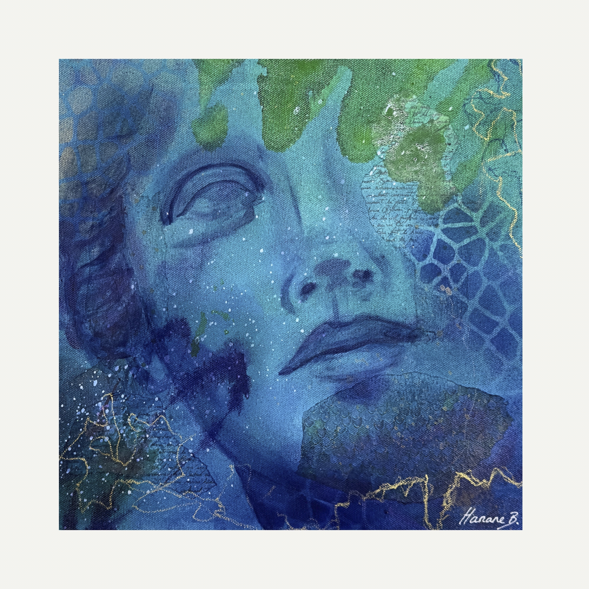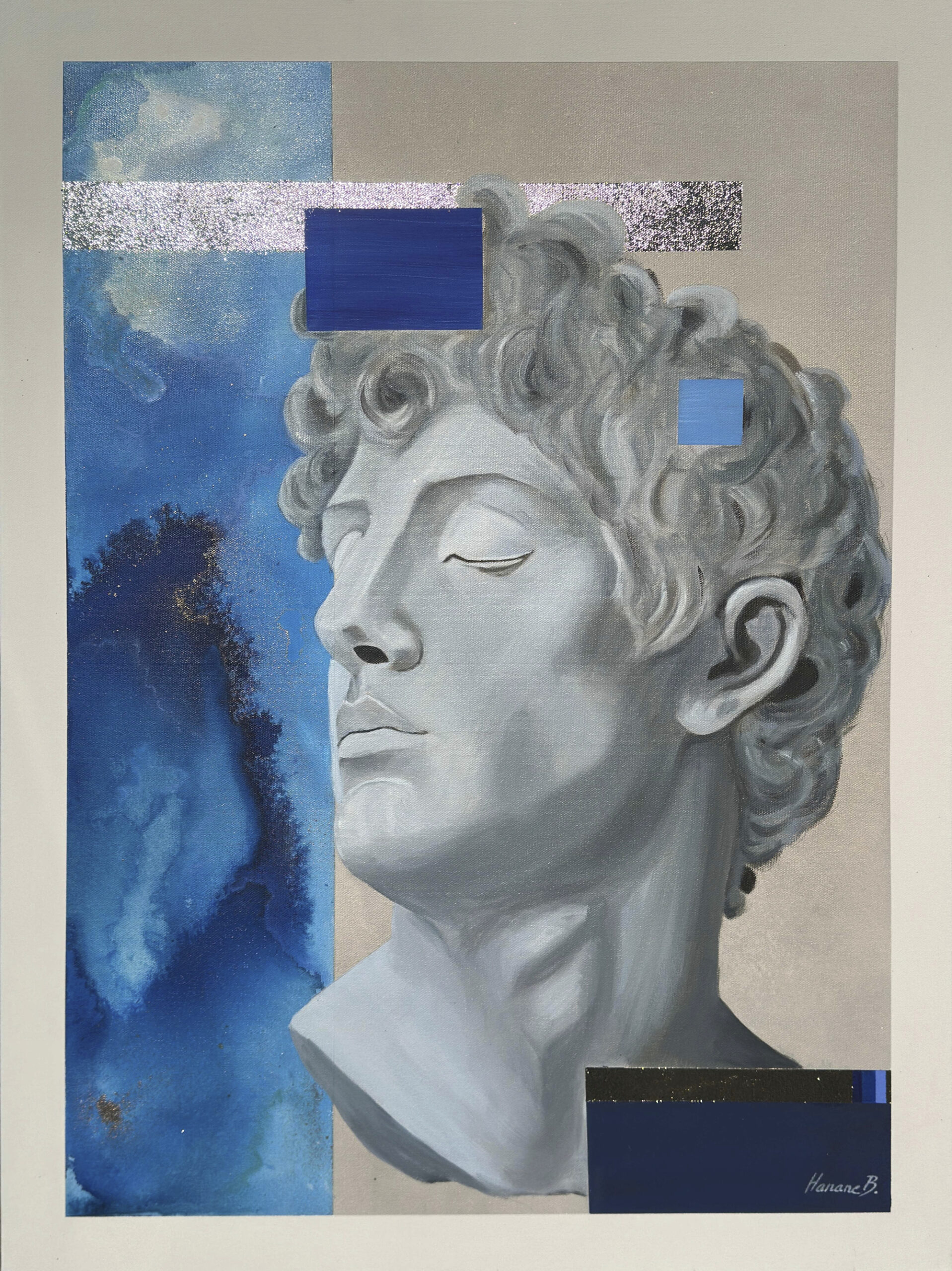 Hanane B. est une artiste peintre qui décline son travail en deux univers : des portraits mythologiques et des œuvres abstraites. Elle stimule nos sens avec des couleurs bleues vibrantes sur des toiles cernées d’une délicate marge écrue. Son portfolio évoque une fusion entre la rigueur de sa formation académique scientifique et une expression artistique en quête de transcendance. L’abstrait lui permet d’exprimer une clé de lecture de l’Univers et de la cosmogonie. Dans ses portraits, elle explore les mythes intemporels qui façonnent la civilisation humaine. Elle y représente des figures inspirées du statuaire greco-romain, qui deviennent modernes, actuelles et parlent aux âmes poétiques comme aux esprits les plus cartésiens. Chez cet artiste, chaque coup de pinceau semble être un acte de célébration à l’héritage civilisationnel et à l’intelligence humaine. Sa démarche vise à explorer la dualité entre l’ancien et le moderne, entre le sacré et le profane, et à utiliser l’art comme un portail dans la quête de soi.