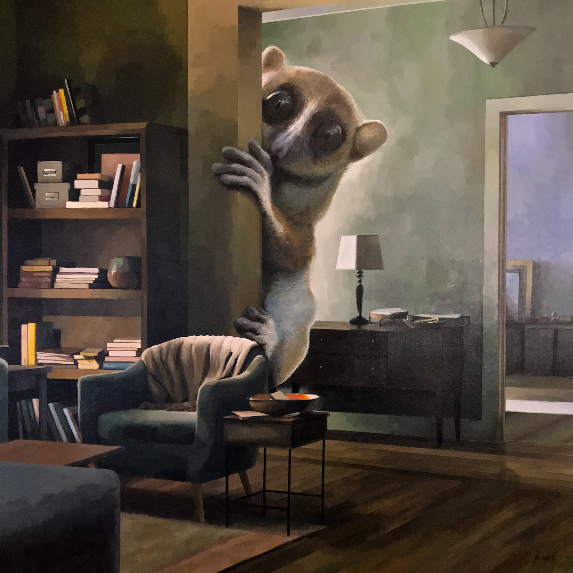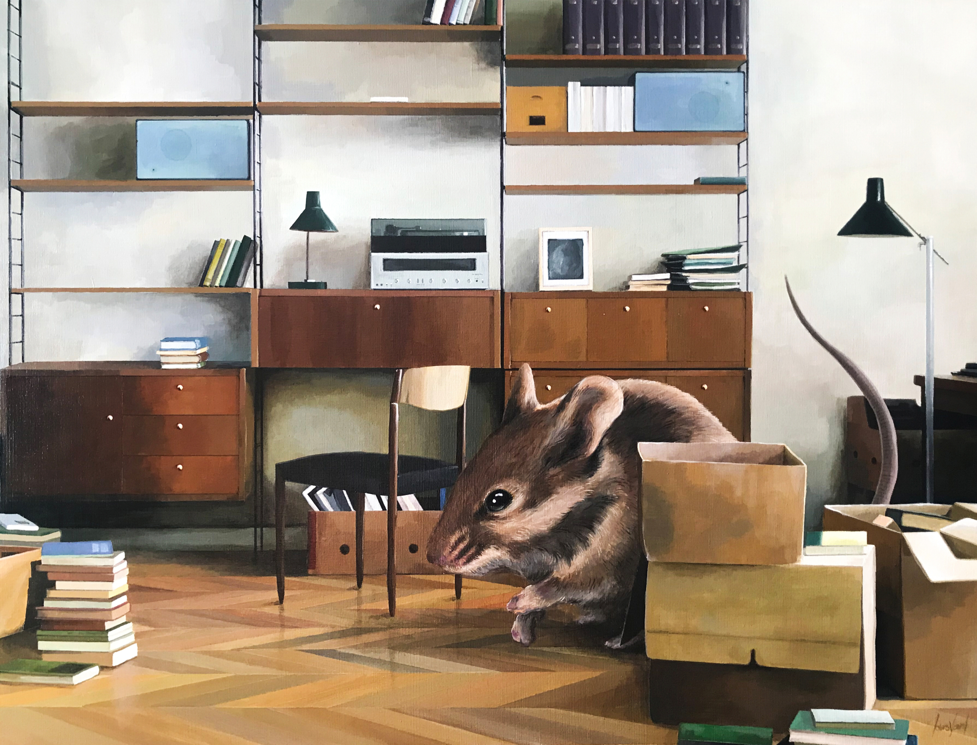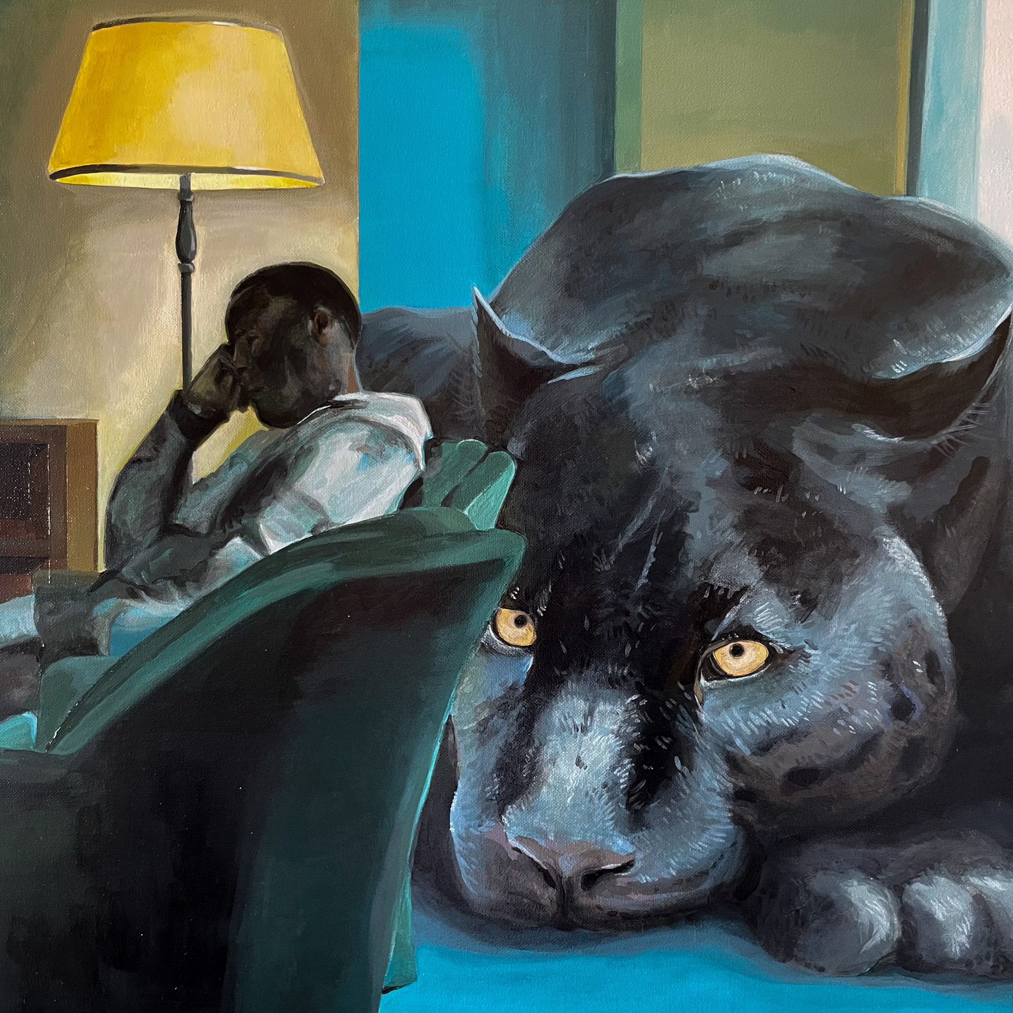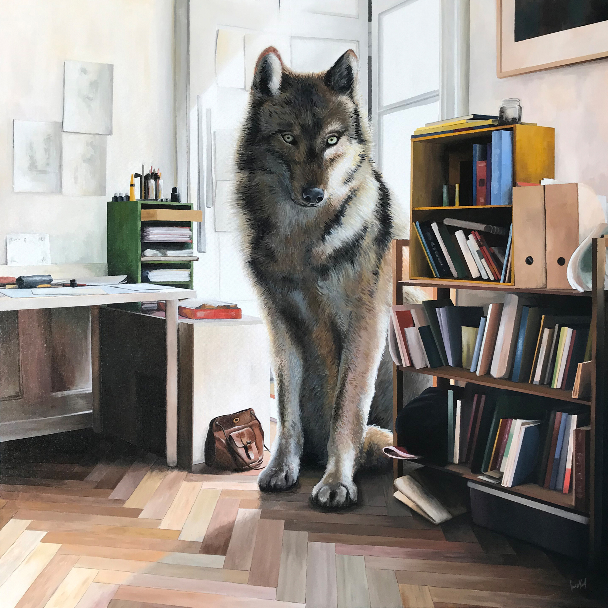 Cet animal qu’on ne rencontre plus qu’à travers l’image. Cet animal qu’on ne connait plus et qu’on considère comme si différent de nous. Je le mets en scène de manière à ce qu’il envahisse l’espace. Sa taille exacerbée le rend inévitable à notre regard, surtout dans un espace domestique et familier. La lecture du tableau est perturbée, la chimère devient une anomalie. Cette série de peintures illustre la relation entre un monde sauvage inconnu et notre quotidien, amplifié par un contraste d’échelle immanquable.”