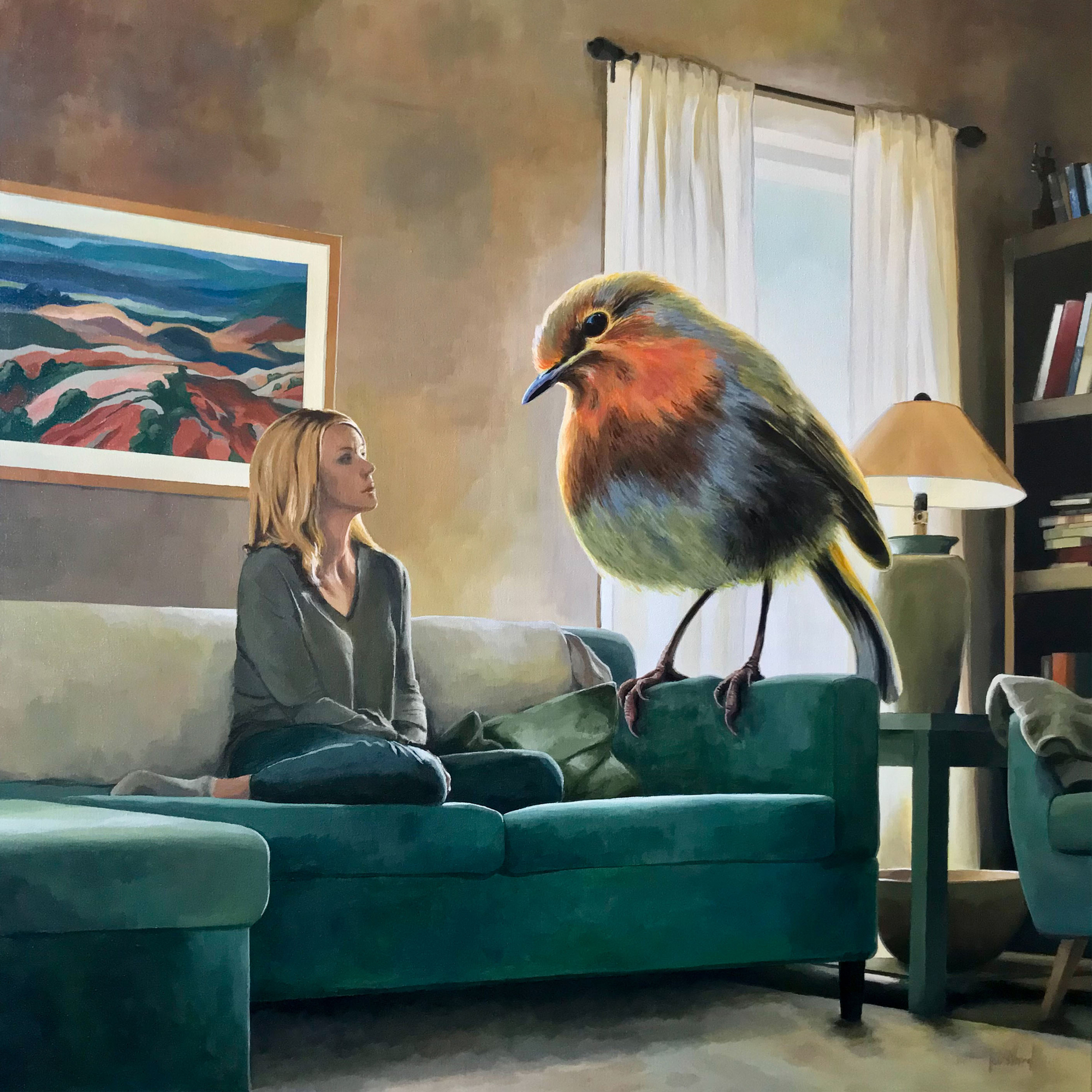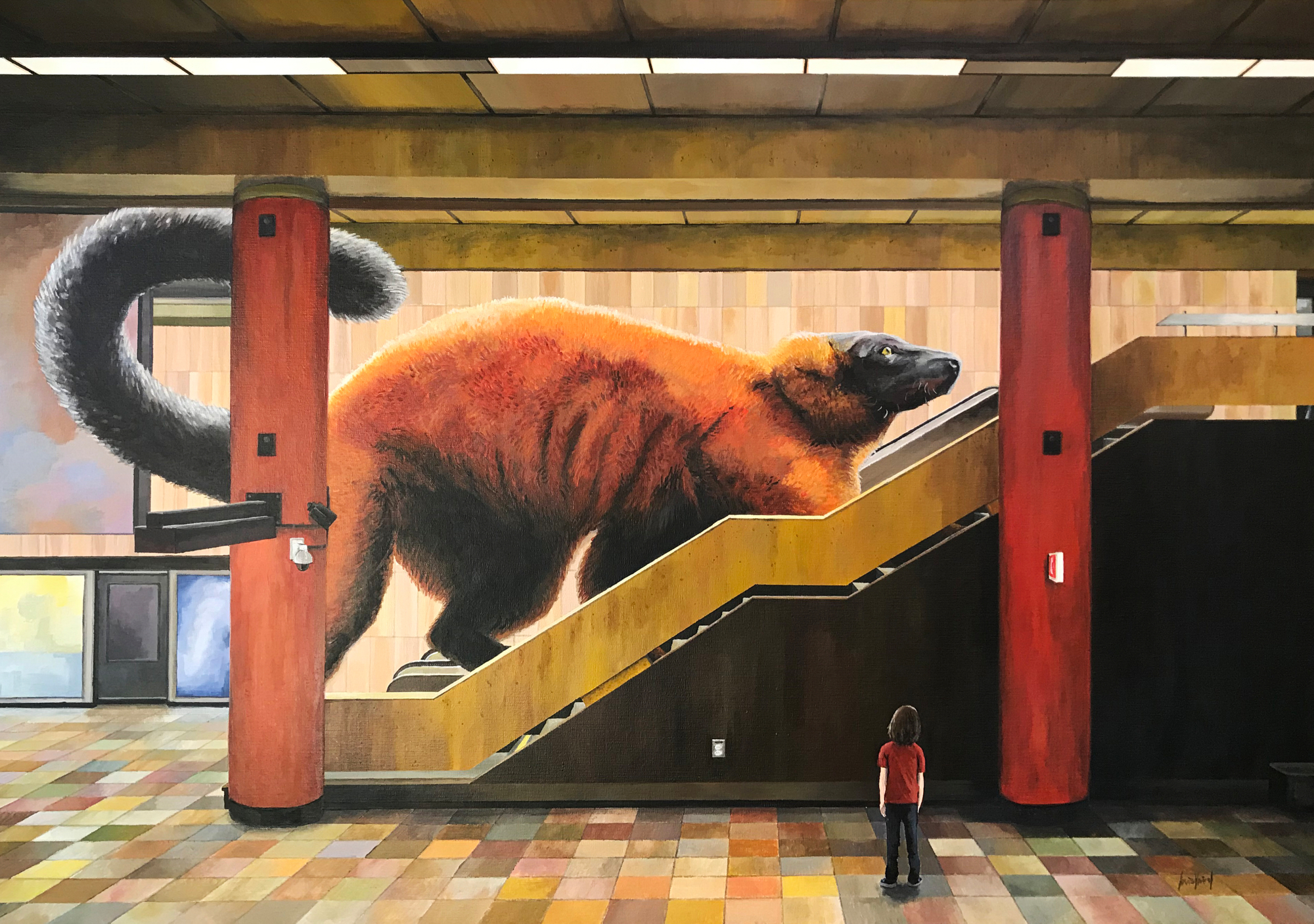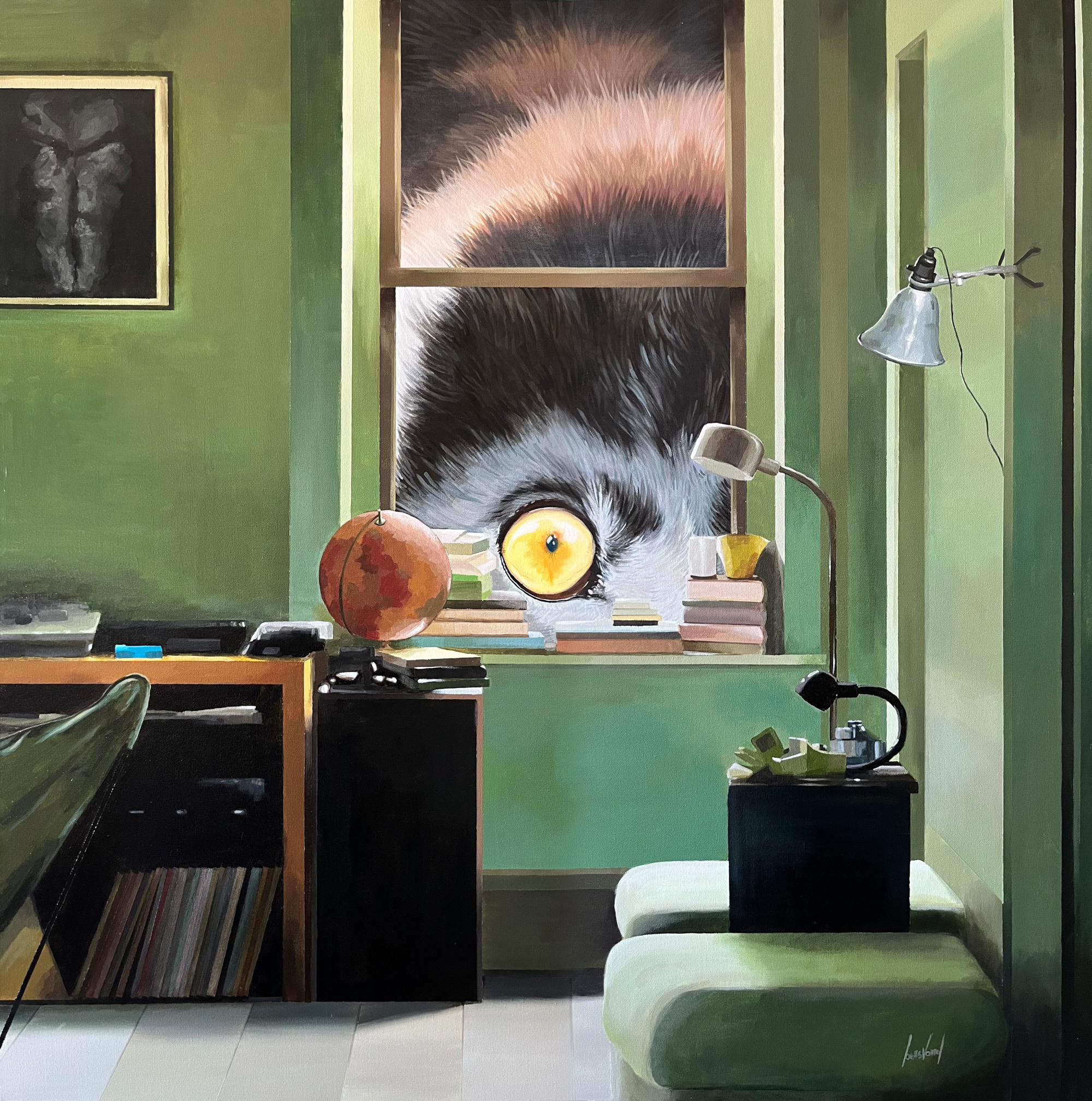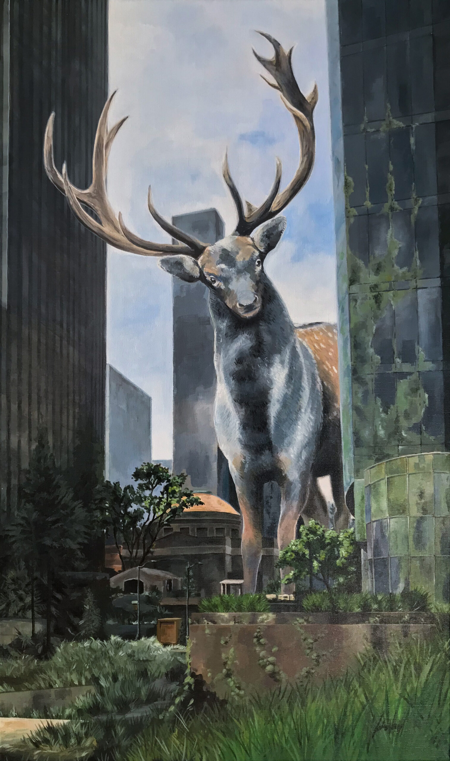 Cet animal qu’on ne rencontre plus qu’à travers l’image. Cet animal qu’on ne connait plus et qu’on considère comme si différent de nous. Je le mets en scène de manière à ce qu’il envahisse l’espace. Sa taille exacerbée le rend inévitable à notre regard, surtout dans un espace domestique et familier. La lecture du tableau est perturbée, la chimère devient une anomalie. Cette série de peintures illustre la relation entre un monde sauvage inconnu et notre quotidien, amplifié par un contraste d’échelle immanquable.”